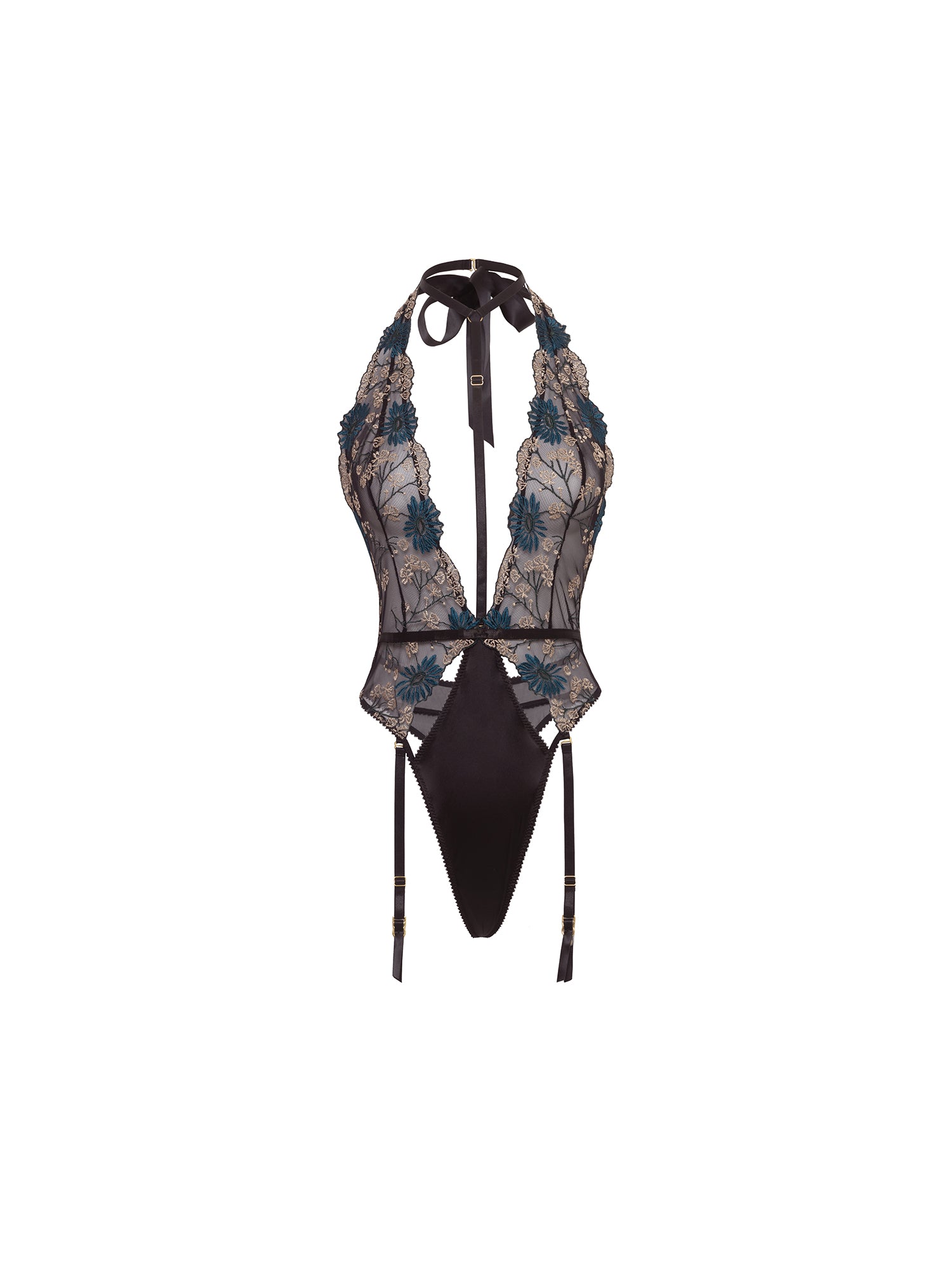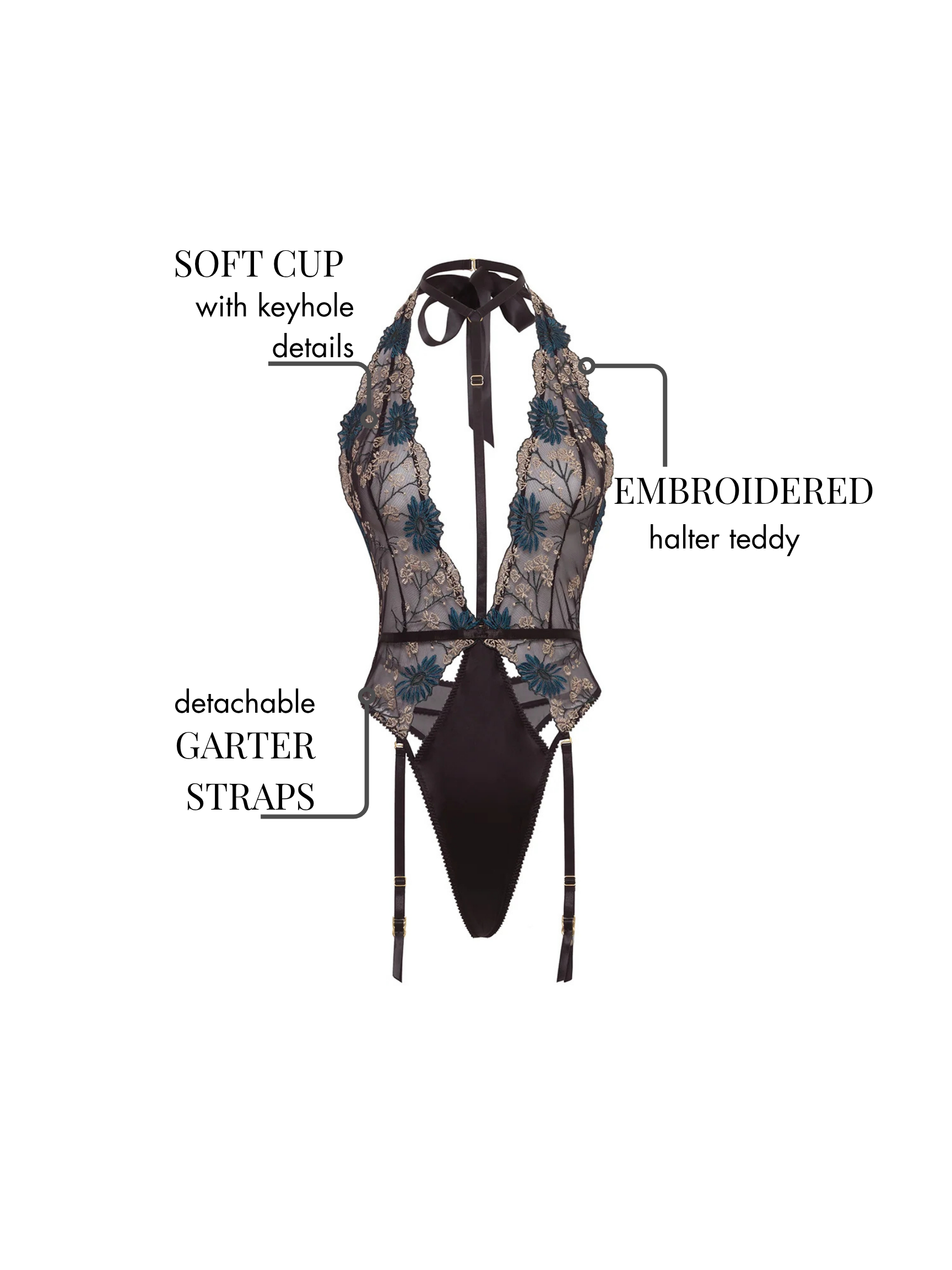 • EMBROIDERED HALTER TEDDY WITH KEYHOLE DETAILS
