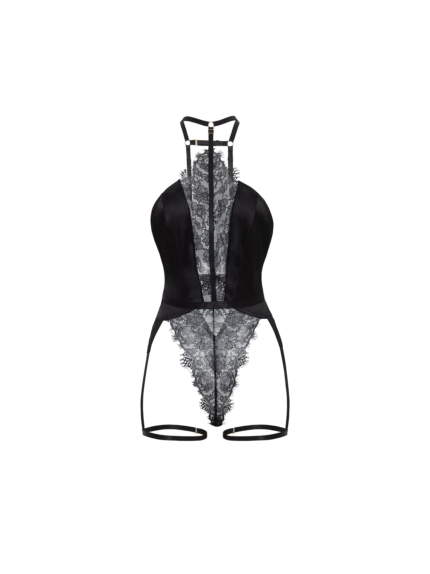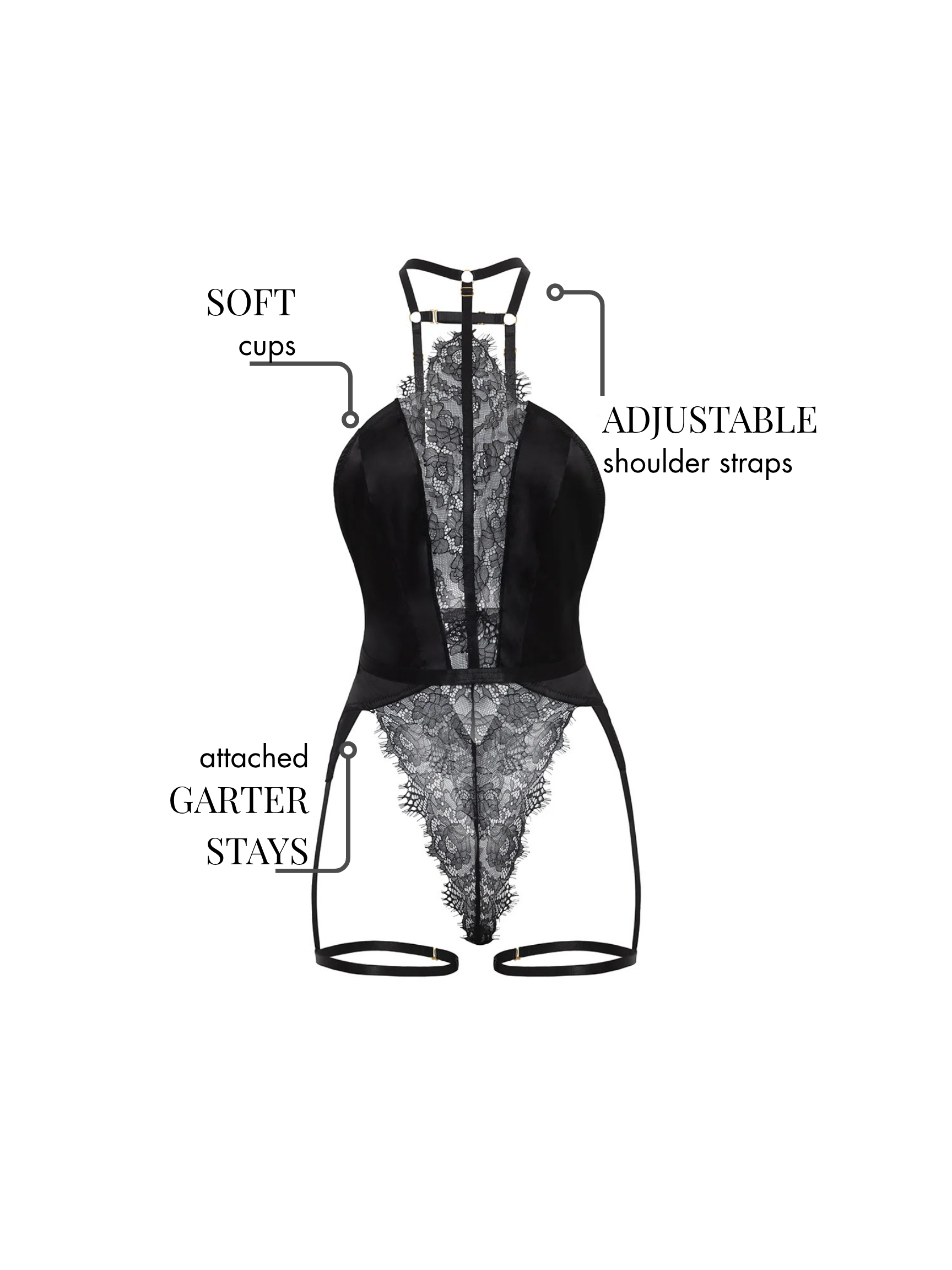 Indulge in the luxurious and exclusive Winnie Harness Lace Teddy, featuring an adjustable harness choker crafted from satin and lace and complemented by attached garter stays. This exquisite bodysuit boasts snap closures for convenience and a thong back for an alluring touch. Pair it with a skirt or pants for a truly stunning look.
