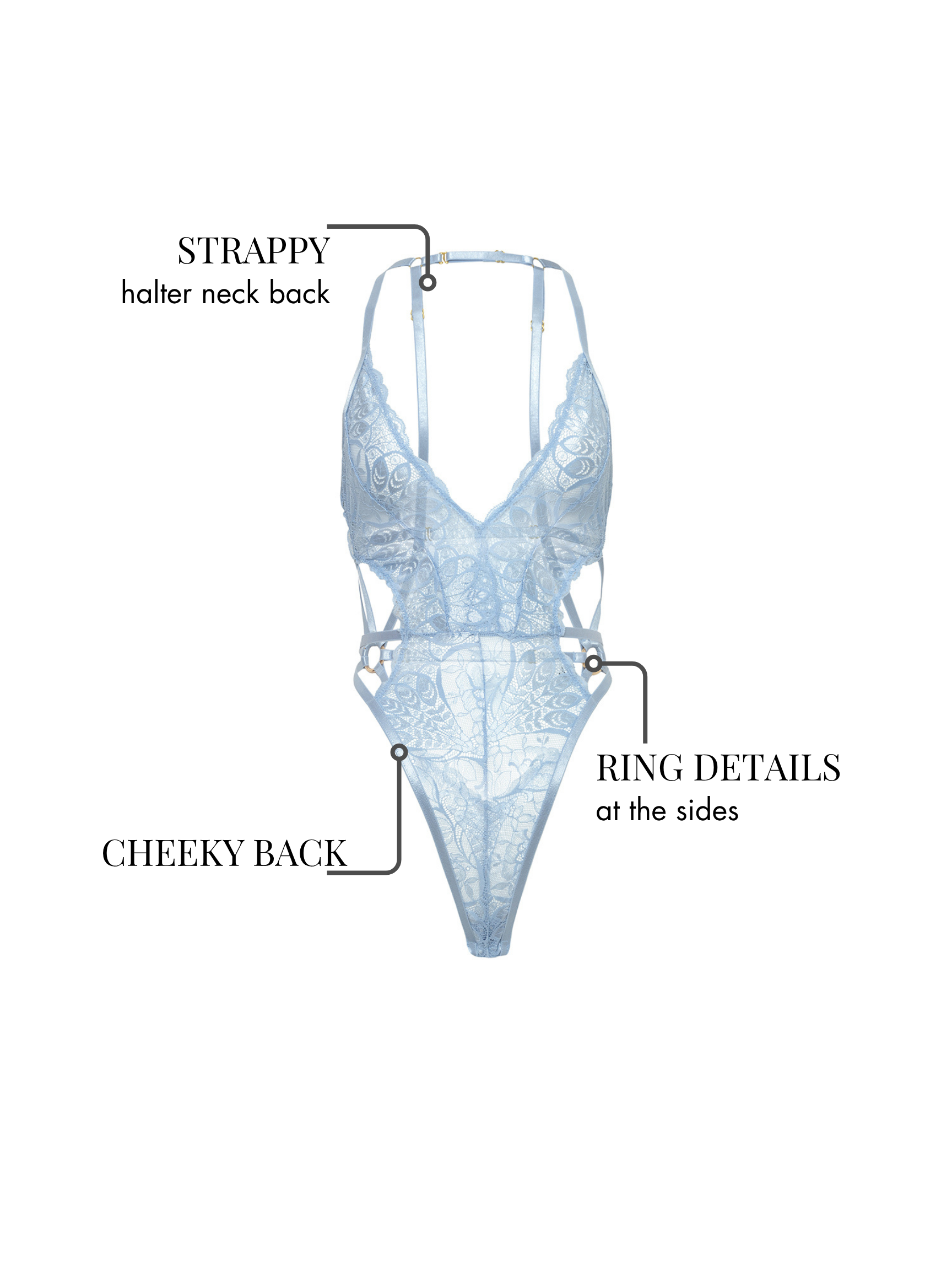 The luxurious Lina Lace Teddy features intricate lace and ring embellishments, creating a stunning and strappy back. Designed with a halter neck and strategically placed cut-outs, this piece offers both style and comfort.