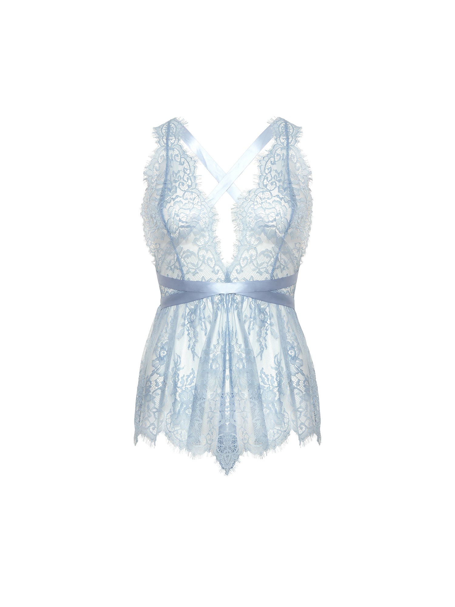 • EYELASH LACE ROMPER WITH OPEN BACK AND WRAP AROUND ROULEAU STRAPPING DETAIL
