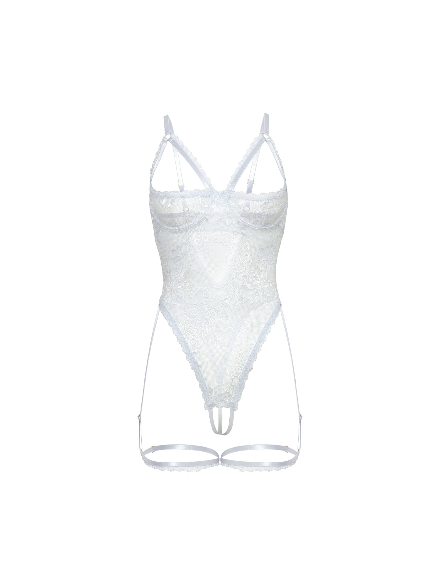 Be the definition of sophisticated elegance in the Elayne Open Cup Teddy. This tasteful, all-over lace lingerie piece features unique open shelf cups, adjustable shoulder straps, and a sleek open gusset with G-string back. Removable garter stays and crotchless design completes the look for an unforgettable night of seduction.
