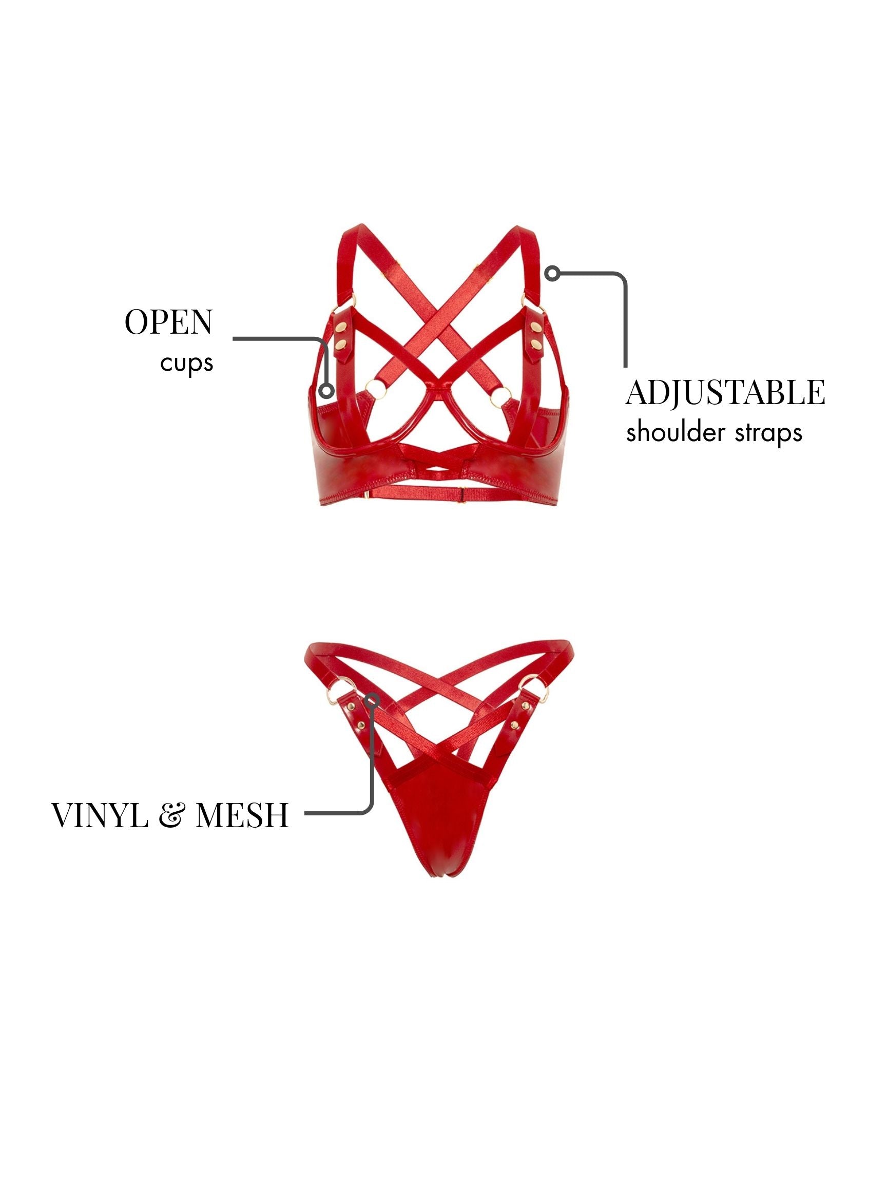 Indulge in your deepest desires with our Fetish Desire Cage Bra Set. Featuring open cups, adjustable shoulder straps, buckle detail and a seductive vinyl and mesh body, this set will leave you feeling empowered and confident. Complete the look with the included thong back.