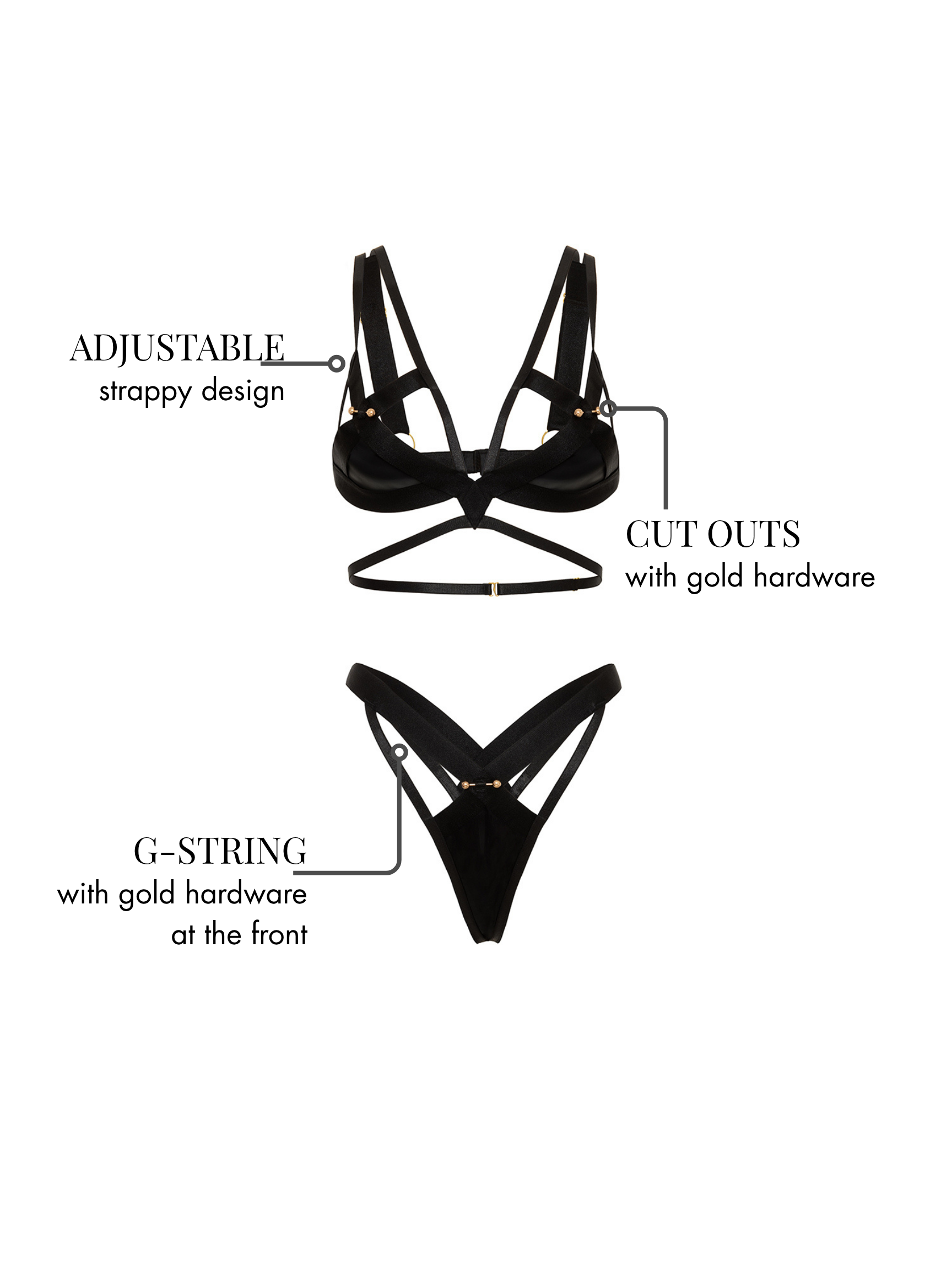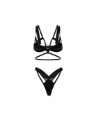 Unleash your inner risk-taker with the Fetish "X" Marks The Spot Bra Set. This daring set features gold hardware, wide straps for support, and an adjustable cage strappy design. The cut-out G-string with hardware detail completes the look. Take charge and make a statement.