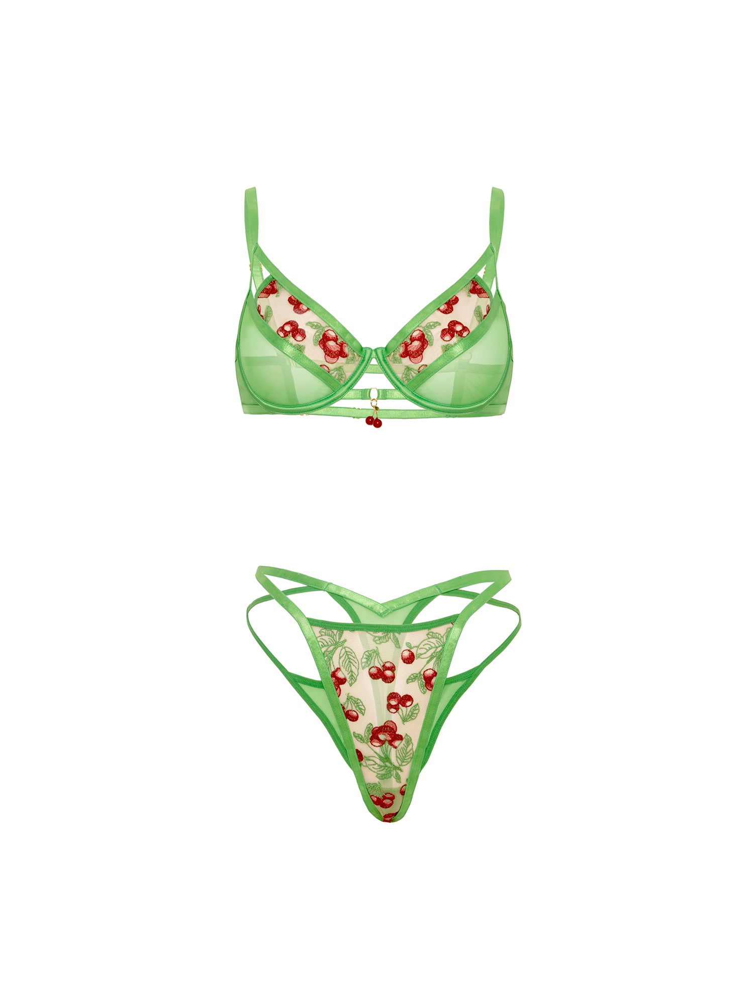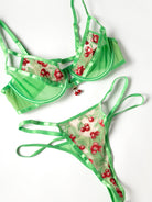 Slip into something made for warm nights and playful moments. The Cheri Embroidered Bra Set brings a flirty twist to sheer bra and panty sets, pairing delicate cherry embroidery with airy mesh and strappy details with a sweet cherry charm. Designed to feel light against the skin, this bra and thong set offers a softly romantic look with just enough attitude, blending flirty details with an effortlessly sexy finish.