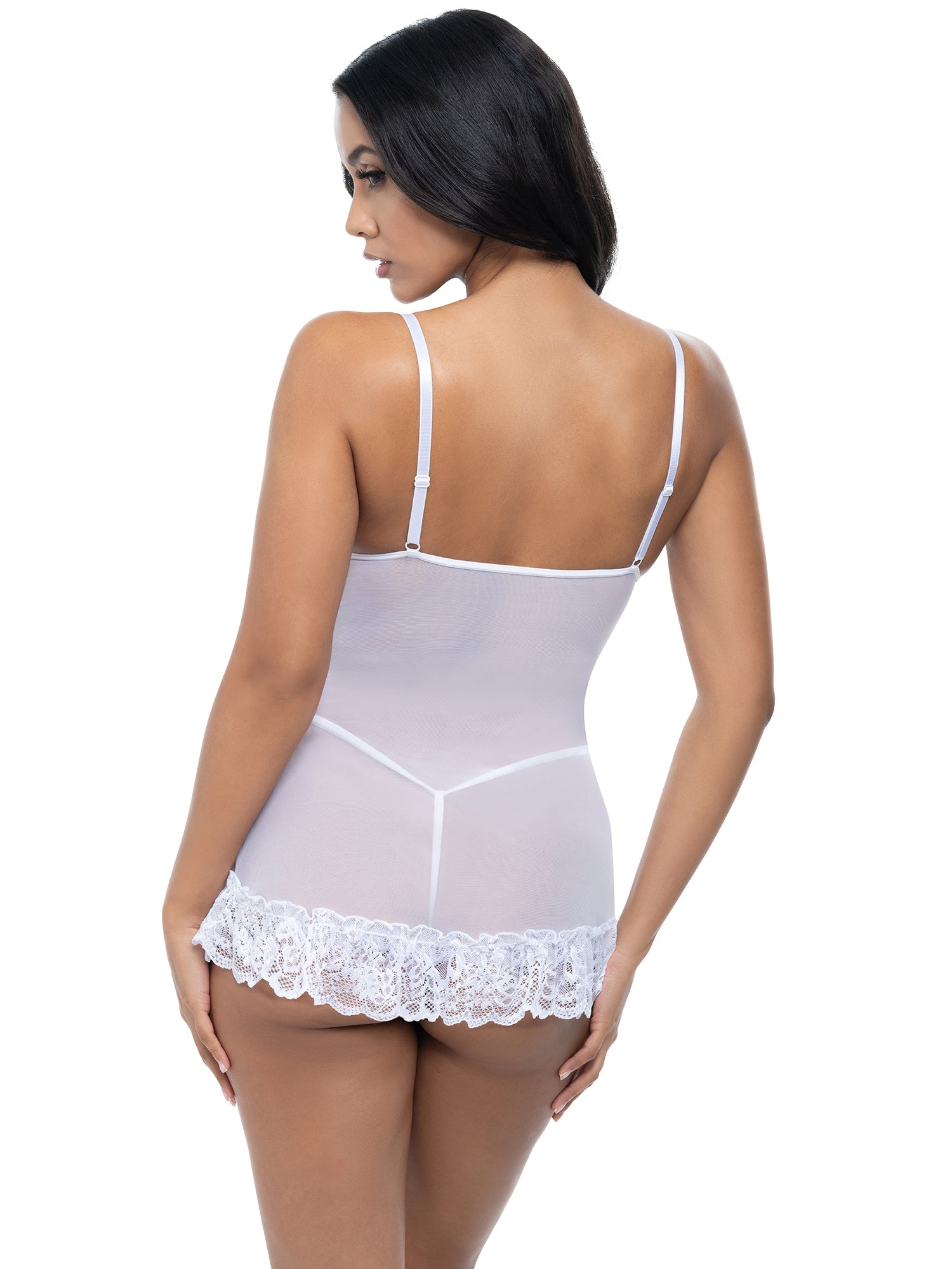 • Sheer mesh body with lace inserts and ruffled lace hem