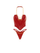Unleash your daring side with our Fetish Chained Bustier Bra Set! This set is made with a boned bodice for a flattering fit, and features halter neck chain straps for a bold and edgy look. The vinyl and mesh body, along with the O-rings, add a touch of kink to this set. Complete the look with the matching G-string back. Take on any adventure with confidence and style in our bra set!