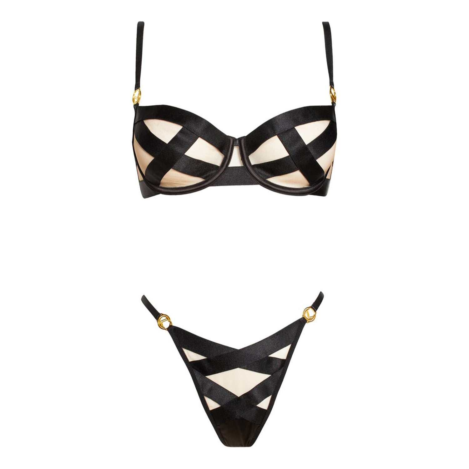 Look smoking' hot in the Raelynn Strappy Mesh Bra Set! Featuring an underwire cup, sling lining, adjustable shoulder straps, and mesh back, you'll love the way this two-piece set looks and feels. Plus, it comes complete with G-string panties and logo hardware, making it the perfect act of spice in the bedroom. Get your hands on it now – this one's a keeper!