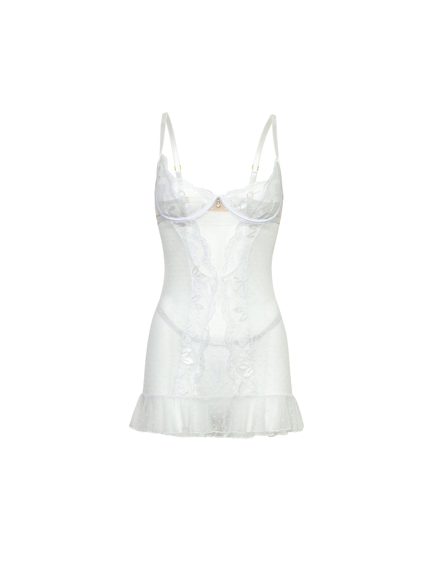 Introducing Portia, the ultimate combination of elegance and charm. This fitted babydoll dress features delicate dot mesh and lace, accented with a flirty ruffle trim. The underwire shelf cup top provides support while adjustable straps ensure a perfect fit. A must-have for any luxurious wardrobe.