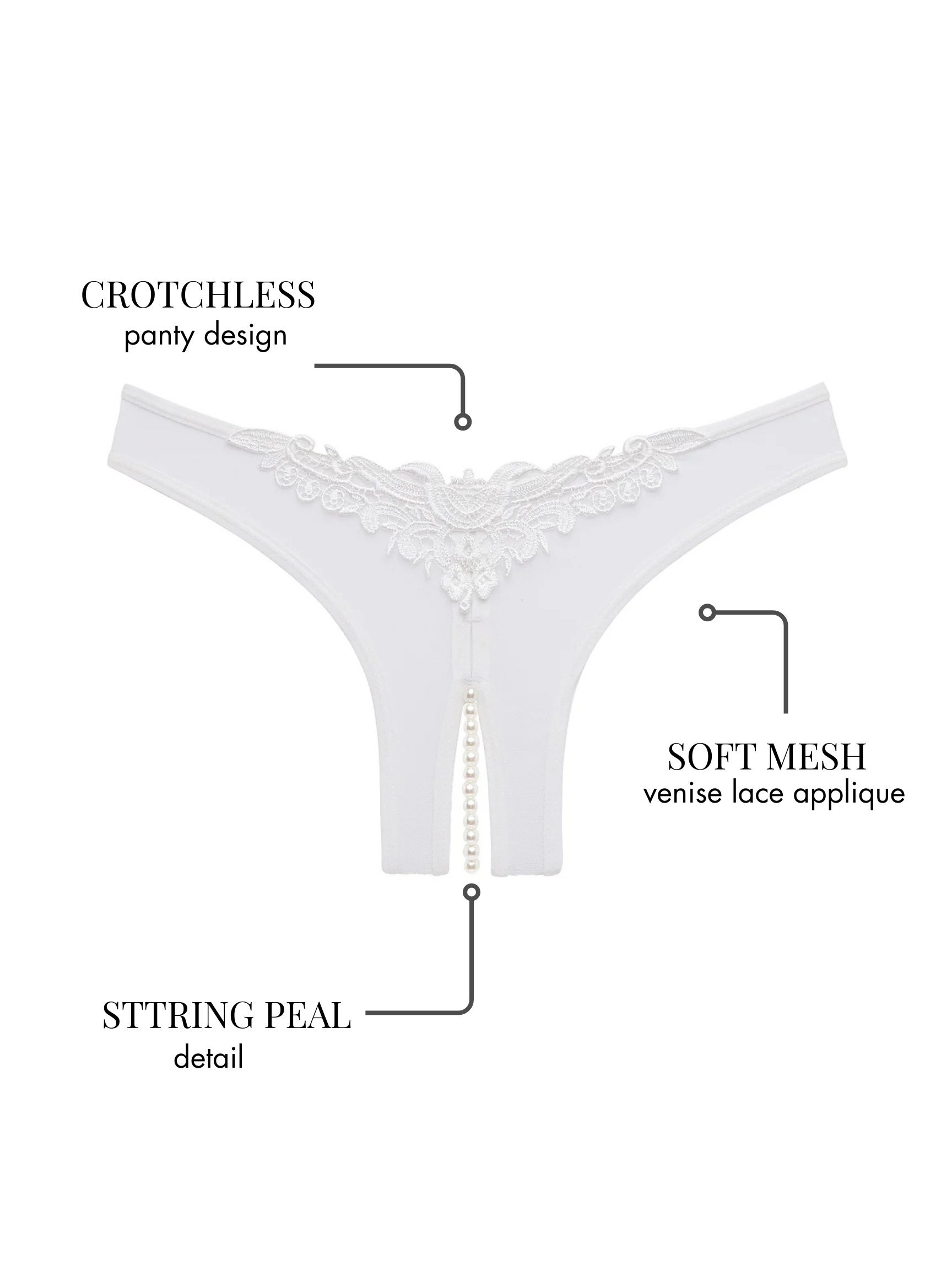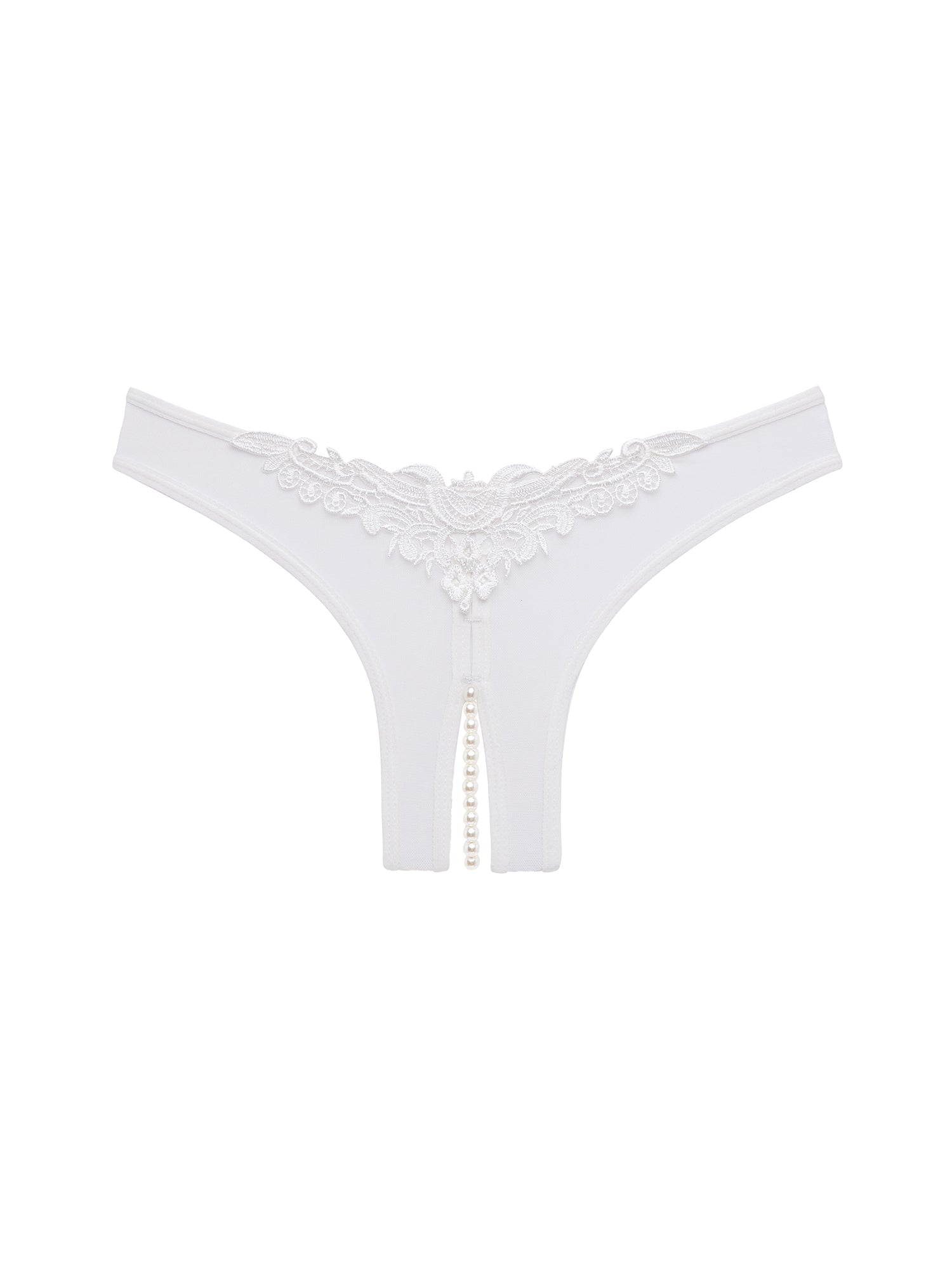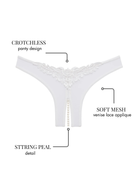 Step into elegance with our pleasure-inducing Paradise crotchless pearl thong that blends luxury with playful charm. Crafted from soft mesh with Venise lace appliqué, this pearl underwear teases in all the right places with a delicate string of pearls along the crotchless panty opening. Our pearl lingerie is ideal for bridal occasions & plus-size beauties as it provides the perfect touch of allure. Available in a wide variety of colors, this pearl string panty will become your favorite sexy secret that you can pair with a camisole or teddy for a smoldering look. Slip on these crotchless pearl panties to enjoy hidden waves of pleasure that only you can feel—Your secret is safe with us.