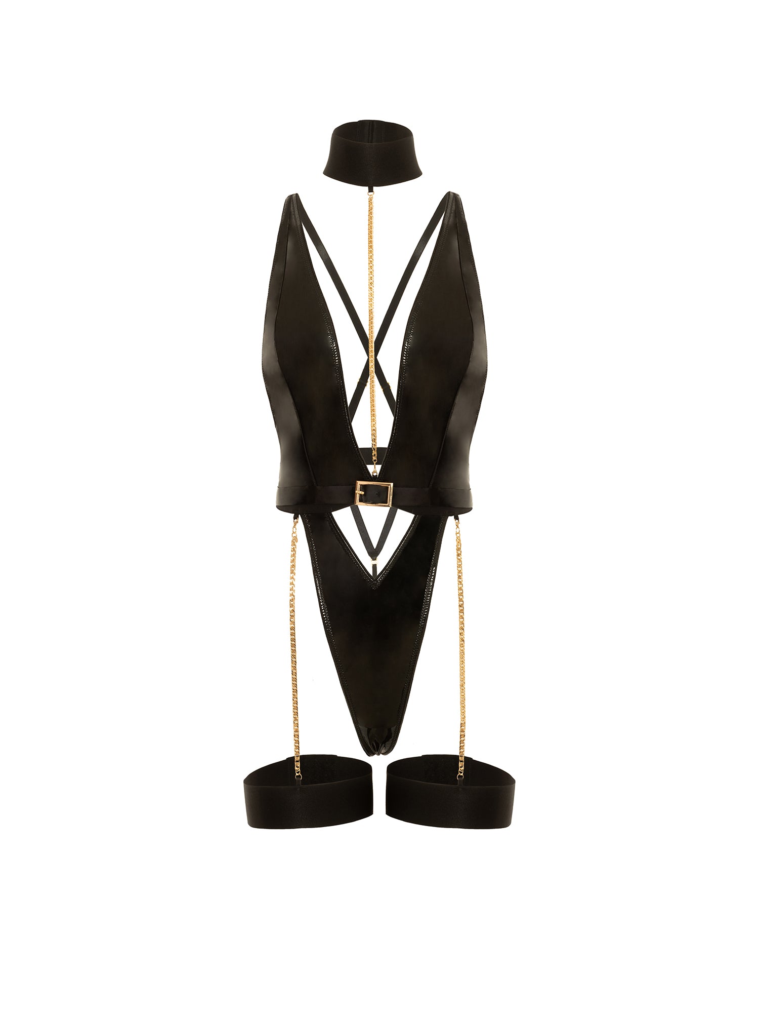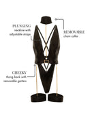 Crafted from quality vinyl, the Fetish Harness Haven Plunge Teddy offers a daring V plunge neckline and adjustable shoulder straps, perfect for a sultry date night. With a nonfunctional belt and detachable chain collar, garter stays, and a thong back, this teddy adds an edgy touch to any lingerie collection.