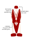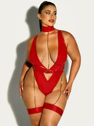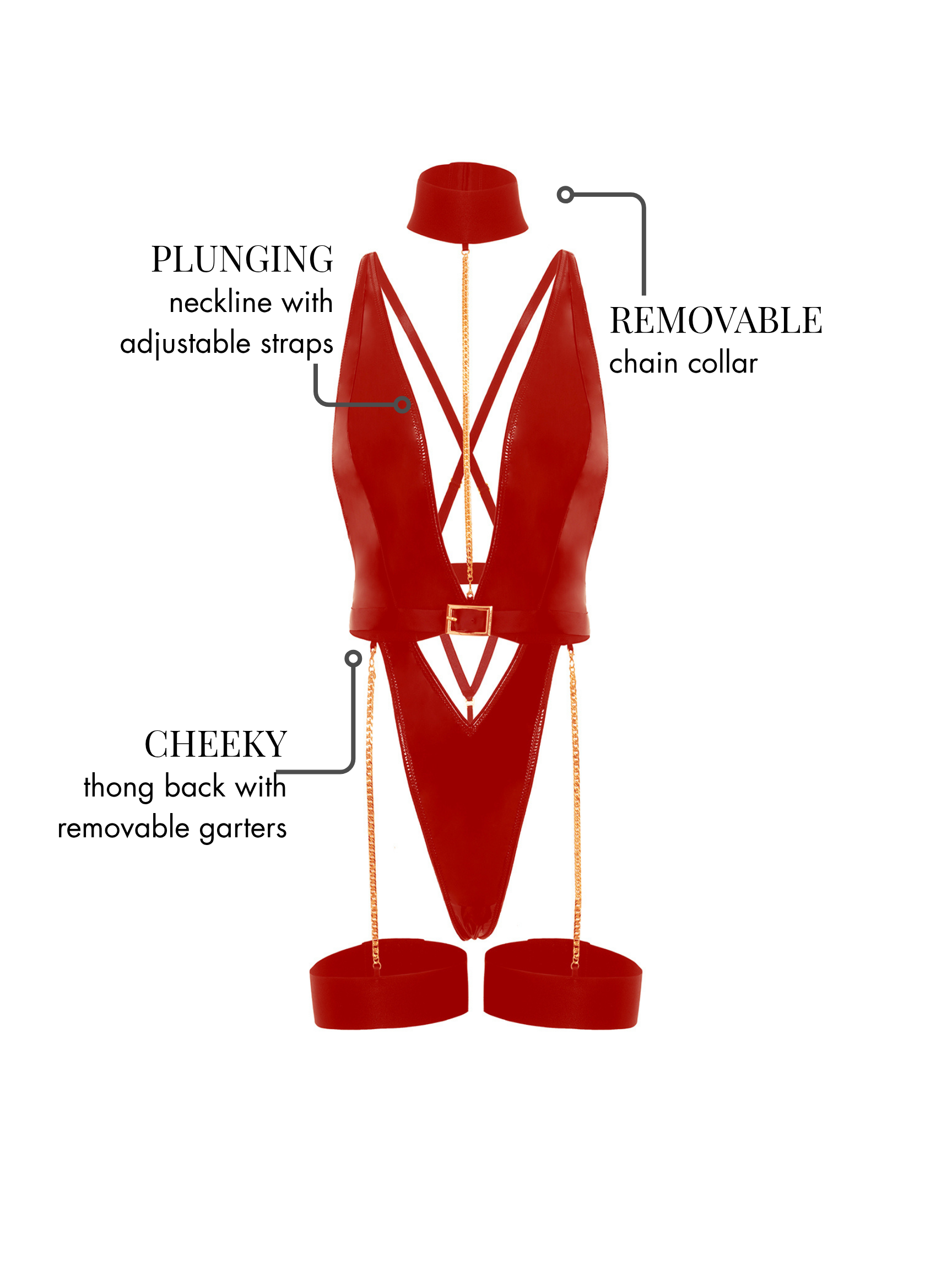 Crafted from quality vinyl, the Fetish Harness Haven Plunge Teddy offers a daring V plunge neckline and adjustable shoulder straps, perfect for a sultry date night. With a nonfunctional belt and detachable chain collar, garter stays, and a thong back, this teddy adds an edgy touch to any lingerie collection.