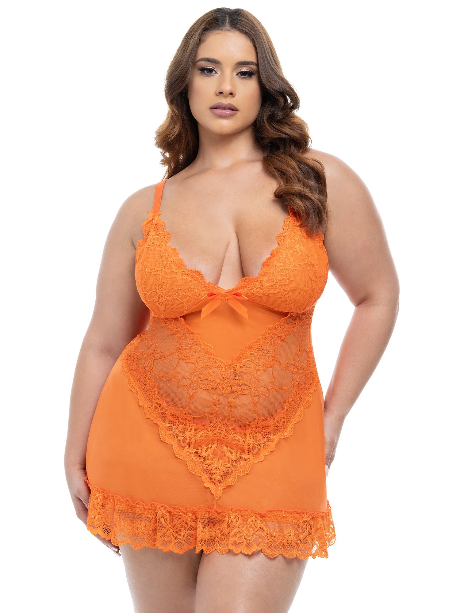 Create an alluring boudoir look with our Curvy Valentine Sheer Babydoll. Luxurious and figure-flattering, it showcases your curves with soft cup galloon lace and mesh body and adjustable shoulder straps. Complete your seductive style with the daring G-string panty, topped with a bow for the perfect finishing touch.