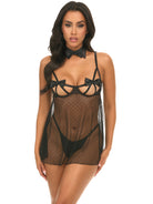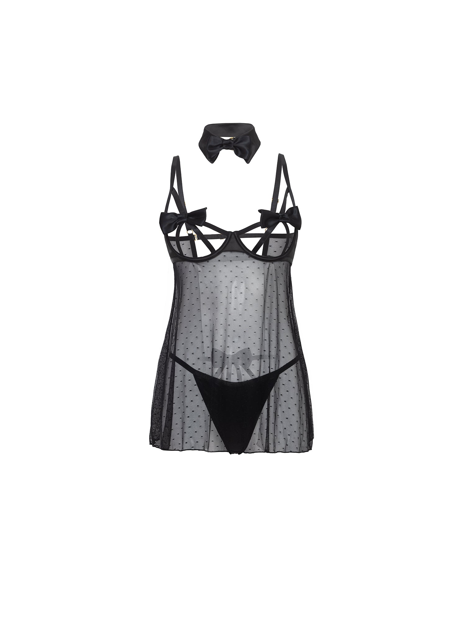 The Kimia Bow Babydoll exudes the seductive charm of a playboy. Featuring a flyaway sheer dot mesh, the bra is embellished with bows and an underwire cage peek-a-boo design. Complete with a cage back G-string with bow detail and a notched bow collar, this piece exudes opulence and sophistication.