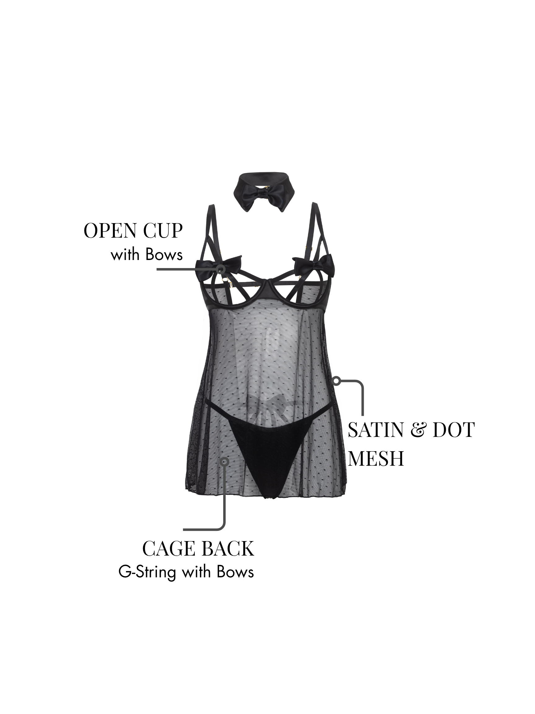 • UNLINED UNDERWIRE SATIN AND DOT MESH OPEN CUP FLY AWAY BABYDOLL WITH BOW DETAILS AND NOTCHED COLLAR ACCESSORY