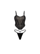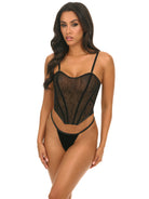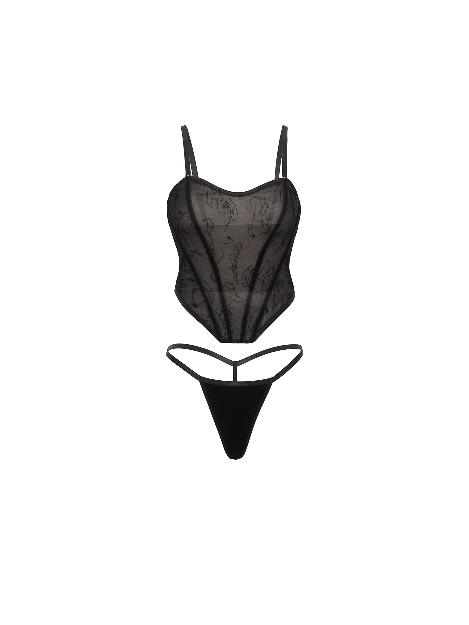Indulge in the ultimate luxury with our Paris Bustier Set, featuring a burnout bodice adorned with hand-drawn art in plush velvet flocking. The boning inserts provide exceptional support and structure, while the removable straps and matching velvet G-string panty add to its elegance. Perfect for the holiday season, this bustier pairs effortlessly with denim, pants, skirts, and more. Elevate your style with our Velvet Burnout Bustier Set.