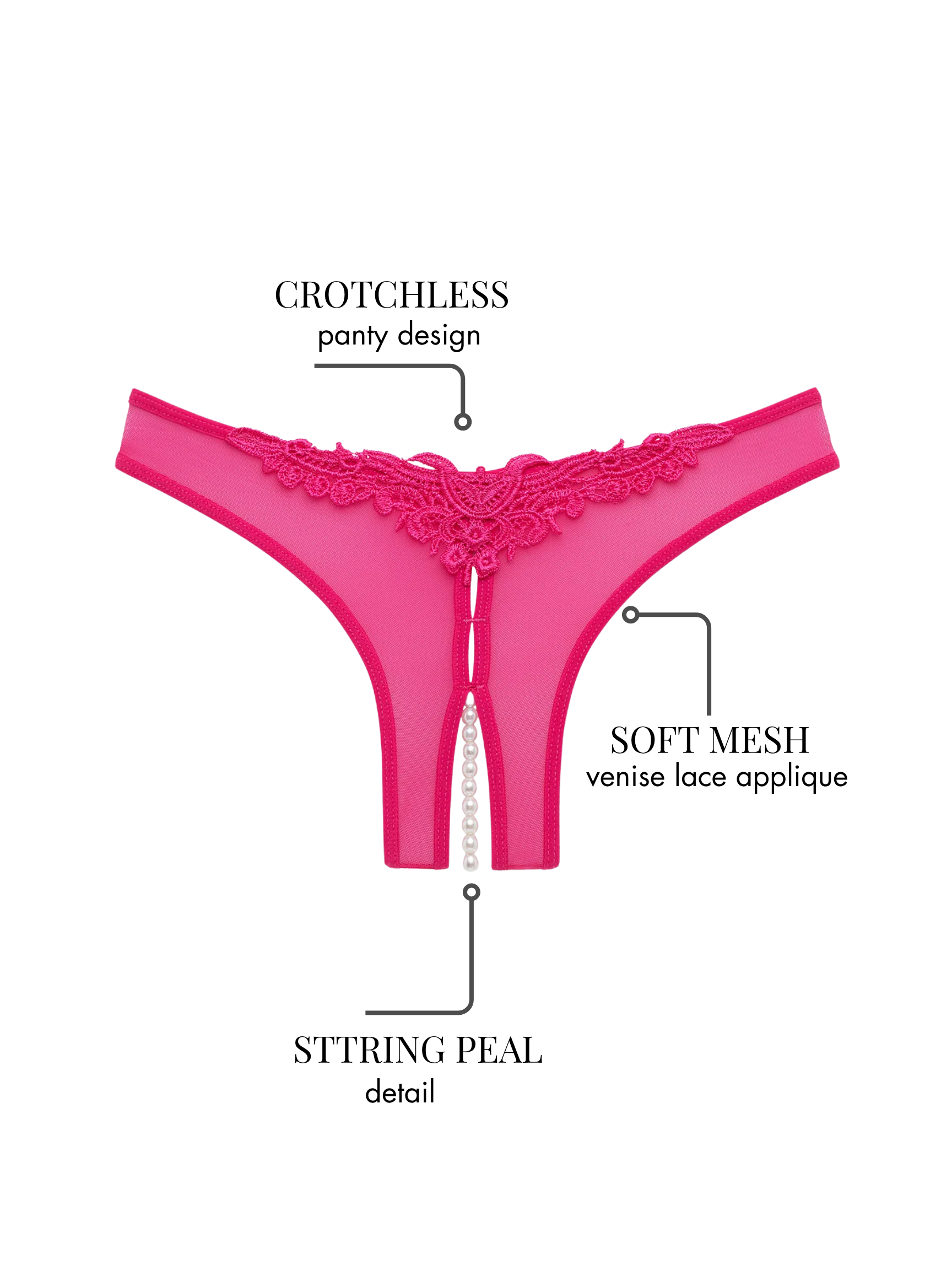 Step into elegance with our pleasure-inducing Paradise crotchless pearl thong that blends luxury with playful charm. Crafted from soft mesh with Venise lace appliqué, this pearl underwear teases in all the right places with a delicate string of pearls along the crotchless panty opening. Our pearl lingerie is ideal for bridal occasions & plus-size beauties as it provides the perfect touch of allure. Available in a wide variety of colors, this pearl string panty will become your favorite sexy secret that you can pair with a camisole or teddy for a smoldering look. Slip on these crotchless pearl panties to enjoy hidden waves of pleasure that only you can feel—Your secret is safe with us.