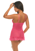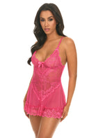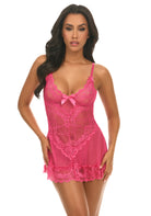 Turn up the romance any season with the Valentine Lacey Babydoll. This stunning A-line lacy babydoll features a seductive triangle cup bodice made from ultra-soft fabrics, ensuring all-night comfort on Valentine’s Day or any day. Adjustable elastic shoulder straps allow for a personalized fit, while the sheer mesh body with lace inserts and flirty ruffled hem adds an elegant touch. The charming bow detail at the center-front, paired with a matching G-string makes this set irresistible. Available in multiple fun colors in standard and plus sizes, this Valentine lace babydoll is the perfect choice for a special night in.