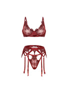 Designed to tease and empower, the Nina 3 Piece Bra and Panty Set is a bold reimagining of classic matching lingerie sets. Featuring an unlined underwire shelf bra, this embroidered trio lifts and sculpts with sultry precision. The delicate see-through bra and panties are balanced by luxe satin touches and daring mesh, while the garter belt set adds a provocative edge. Perfect for lingerie lovers craving a structured yet revealing look, Nina is your invitation to play.