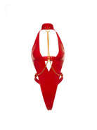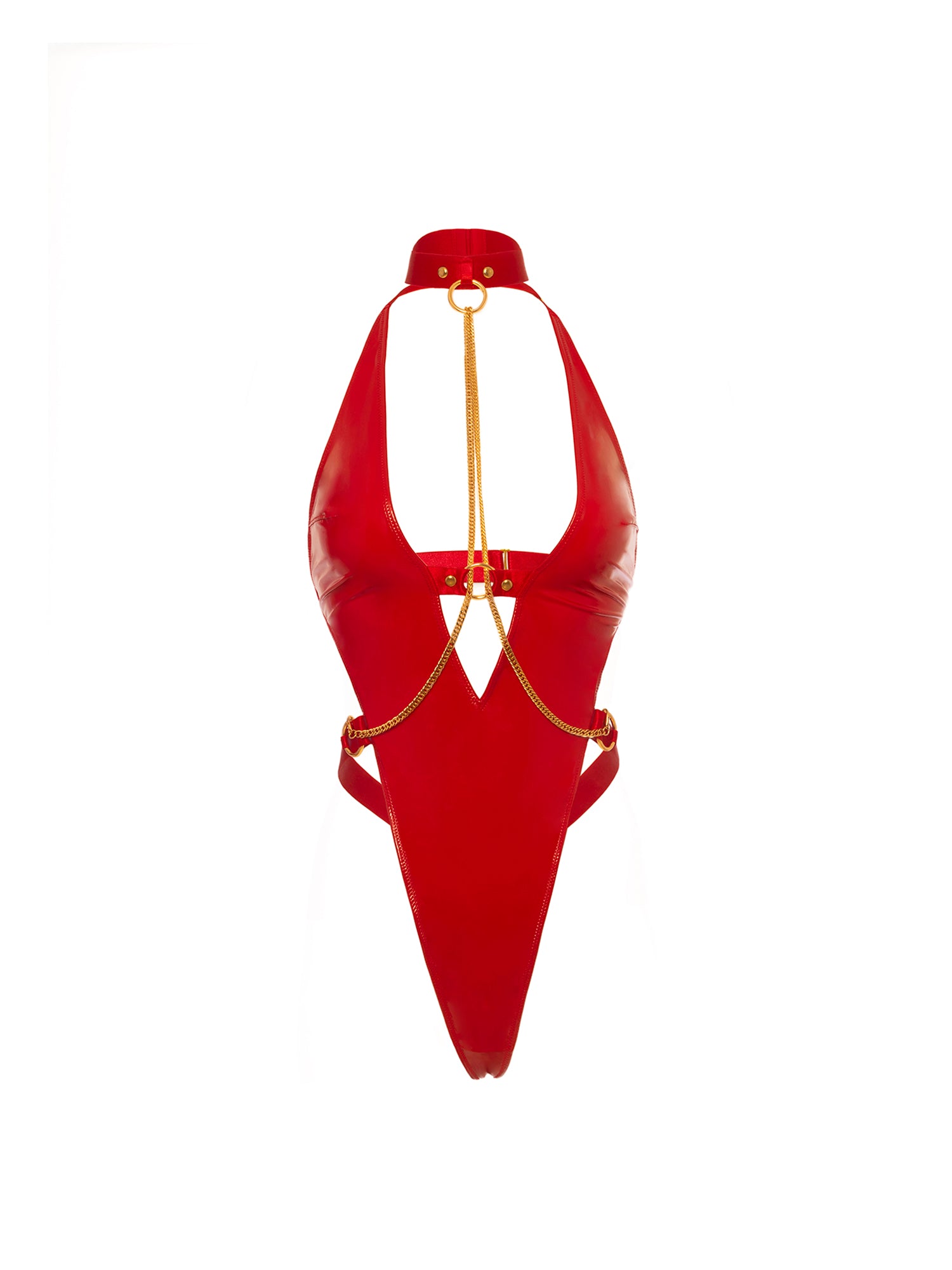 Unleash bold desires with our plunge teddy crafted from sleek vinyl with daring chains that exude confidence & kink. Designed for those embracing their submissive side, this vinyl teddy features a plunging cut-out front, a G-string back & a chain-detailed neck collar, adding a seductive edge to any night of play. Complete with soft vinyl cups, O-rings, cuffs & a Cuban-linked chain, this submissive lingerie piece is perfect for setting the mood & indulging in bold fantasies. Also available in plus sizes, our fetish submissive chain teddy plunges to flatter every curve, ensuring a striking silhouette that’s impossible to resist.